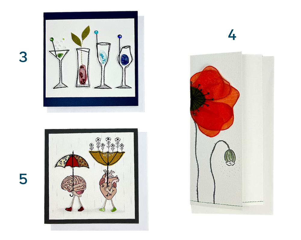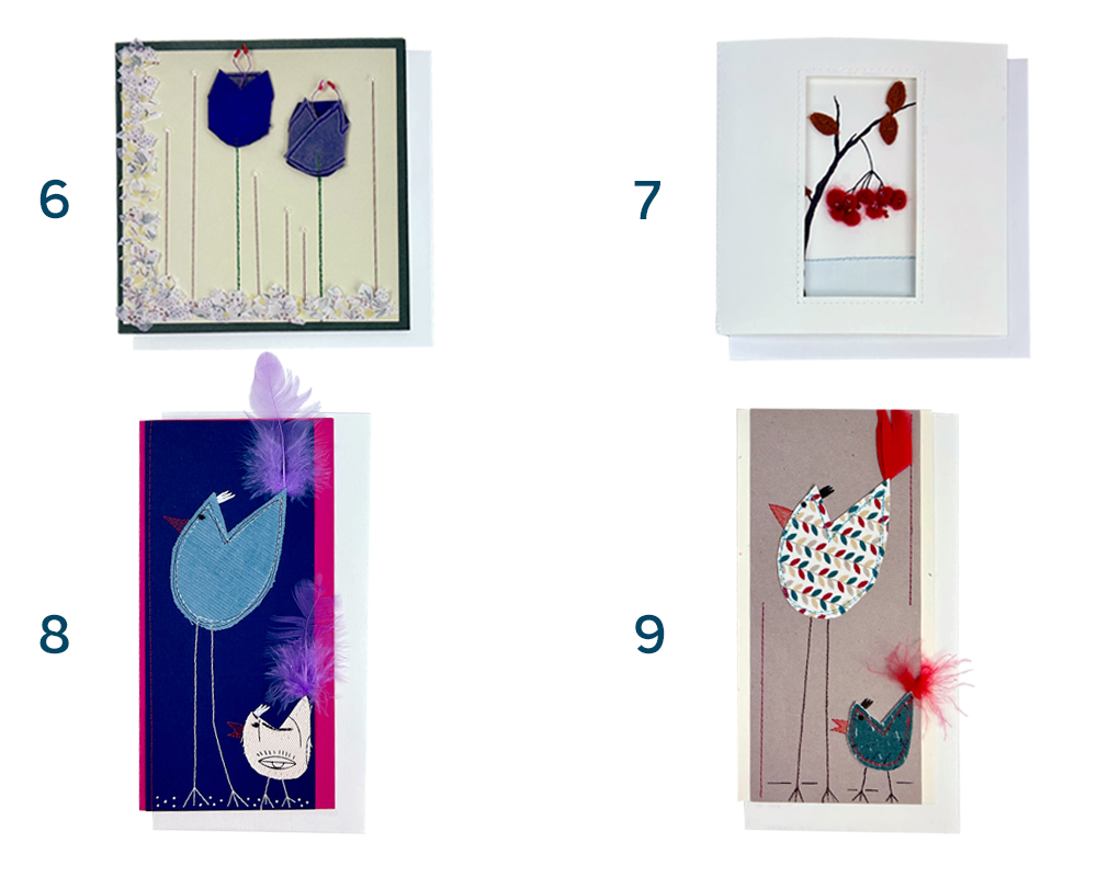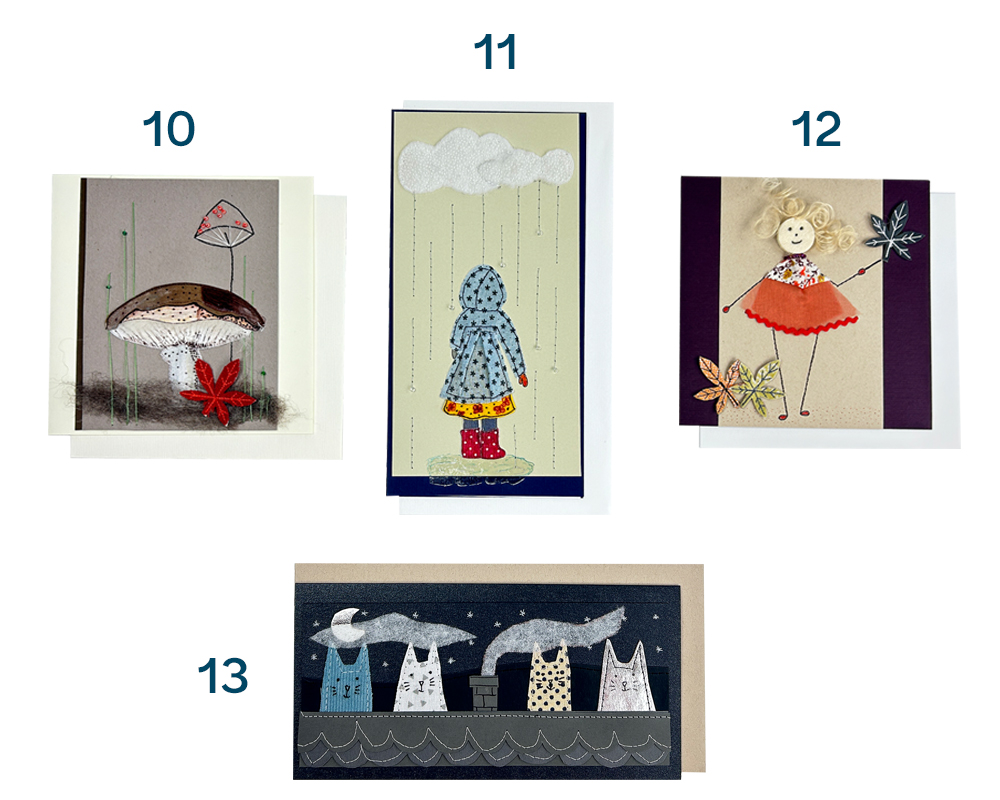 Karten 3-13: genäht, Textilapplikationen