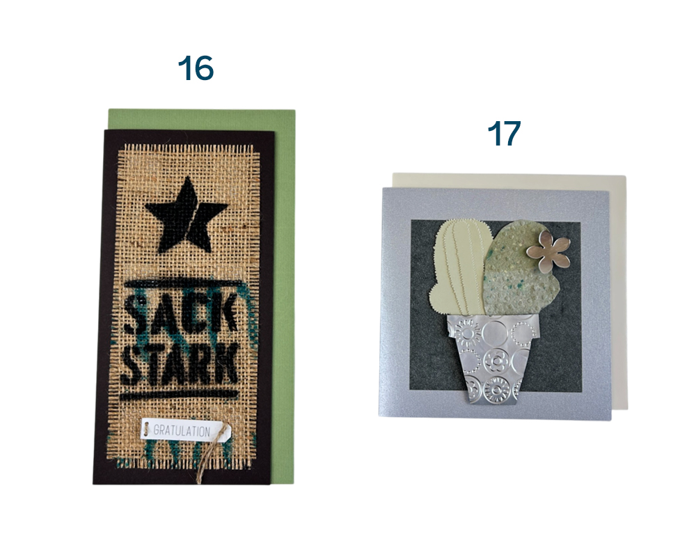 Karten 16-17: gefaltet, gestanzt, geprägt, Upcycling-Produkt aus Kaffeesäcken und Aludosen